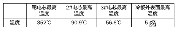 根據現場監控數據顯示,熱失控那顆電芯最高溫度達到了352度,而相鄰的2#電芯過程最高溫度為90.9℃,3#電芯過程最高溫度為56.6℃,冷板外表面最高溫度為55.6℃。