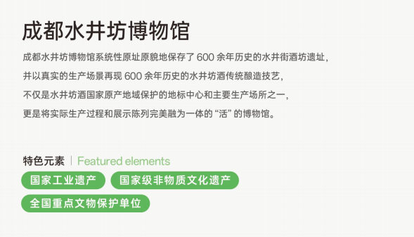 水井坊博物館系統性原址原貌地保存了600年歷史的水井街酒坊遺址,并以真實的生產場景再現600年歷史的水井坊酒傳統釀造技藝,是水井坊酒國家原產地域保護的地標中心和主要生產場所之一,是將實際生產過程和展示陳列完美融為一體的“活”的博物館。