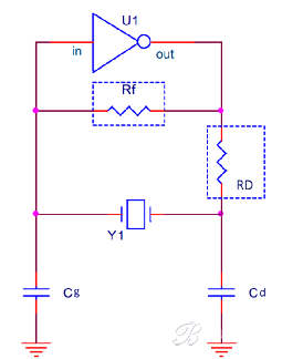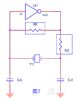 這個電阻的作用是限制IC的驅動能力,并且與Cd組成一個低通濾波器,以確保振蕩器的起振點在基頻上,而不是在其他高次諧波頻率點上(避免3次,5次,7次諧波頻率)。如果晶振的功耗超過晶振制造商的給定值,外部電阻Rd是必需的,用以避免晶振被過分驅動。如果晶振的功耗小于晶振制造商的給定值,就不推薦使用Rd,可以預設0?。如圖3所示