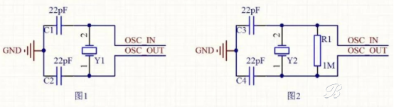 在實際的產品設計時,晶振部分的電路會有下面2種電路,圖1電路中,沒有1M的反饋電阻,圖2電路中,晶振會并聯一個1M的電阻,