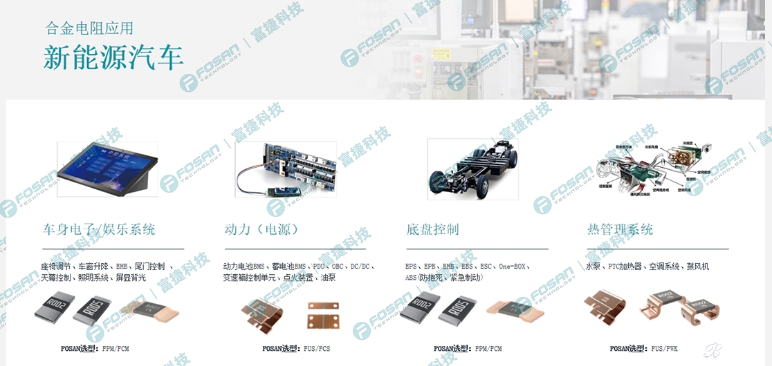 在新能源汽車中,富捷合金電阻可用于車身電子娛樂系統、動力電池 BMS 電流采樣、底盤控制和熱管理系統。