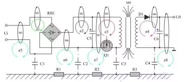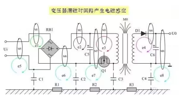對變壓器進行磁屏蔽、盡量減少每個電流回路的有效面積,圖中的電磁感應干擾,最為嚴重的是變壓器漏感所產(chǎn)生。若將變壓器的漏感視為變壓器感應線圈的初級,則其它回路可視為是變壓器的次級,所以在變壓器周圍的回路中,都會被感應產(chǎn)生干擾信號。減少干擾的方法,一是對變壓器進行磁屏蔽,二是盡量減少每個電流回路的有效面積。