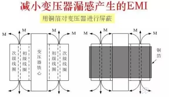 對變壓器屏蔽,主要是減小變壓器漏感磁通對周圍電路產(chǎn)生電磁感應干擾,以及對外產(chǎn)生電磁輻射干擾。雖然非導磁材料對漏磁通起不到直接屏蔽作用的,但銅箔是良導體,交變漏磁通穿過銅箔的時候會產(chǎn)生渦流,而渦流產(chǎn)生的磁場方向正好與漏磁通的方向相反,部分漏磁通可以被抵消,所以銅箔對磁通也可以起到很好的屏蔽作用。