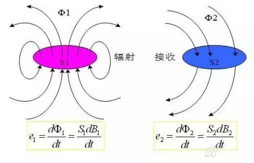 e1、 Φ1、S1、B1分別為輻射電流回路中產(chǎn)生的電動勢、磁通、面積、磁通密度;e2、 Φ2、S2、B2分別為輻射電流回路中產(chǎn)生的電動勢、磁通、面積、磁通密度。